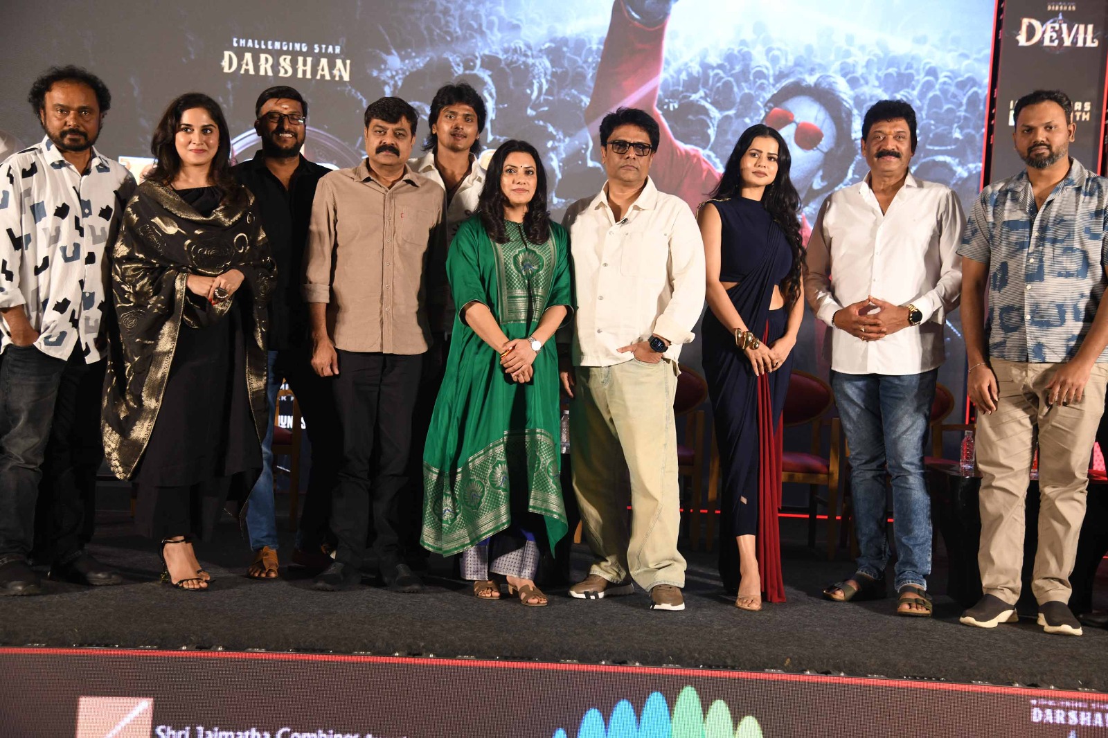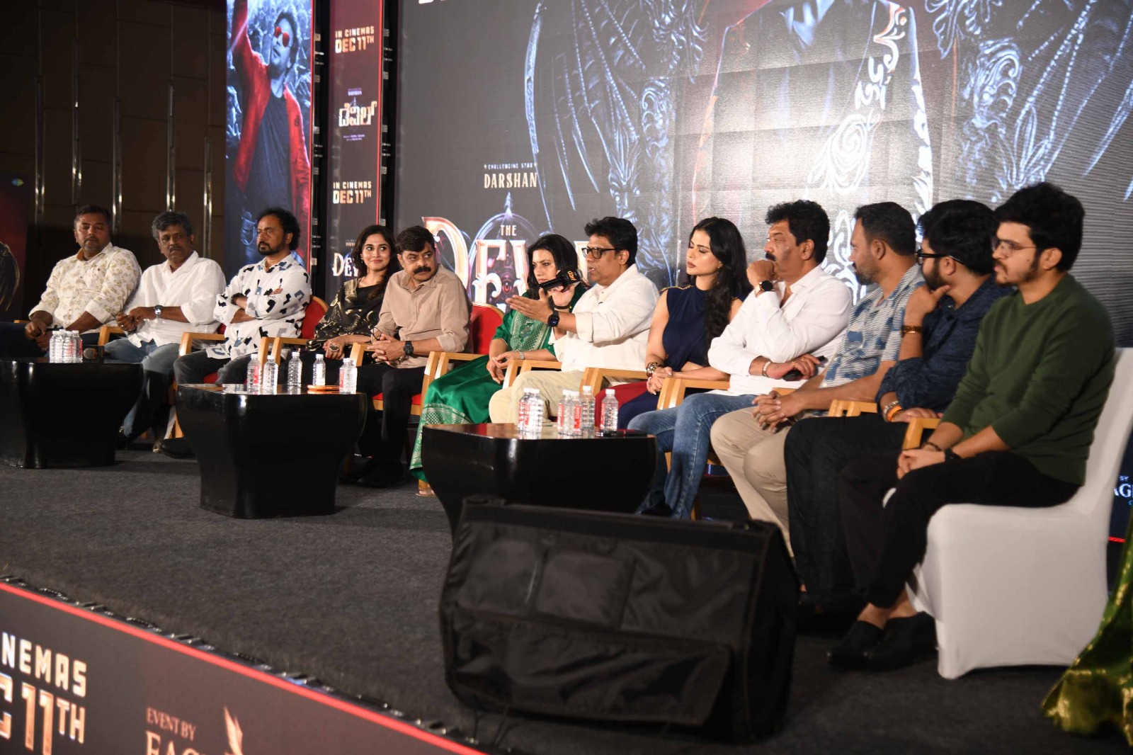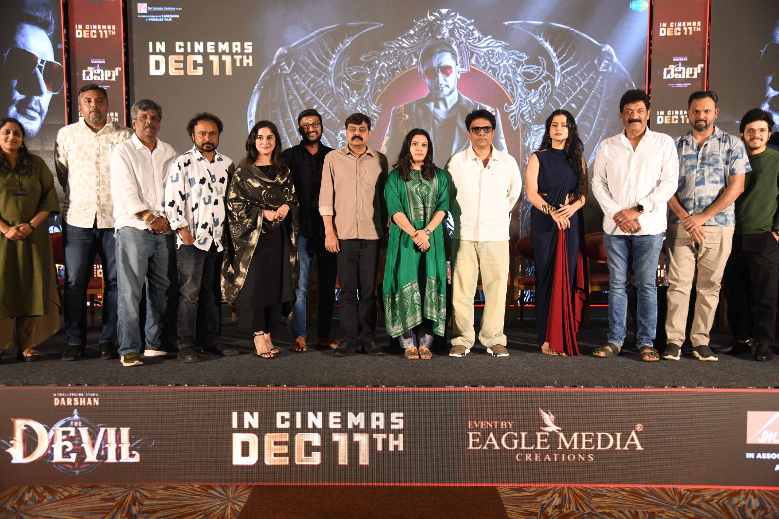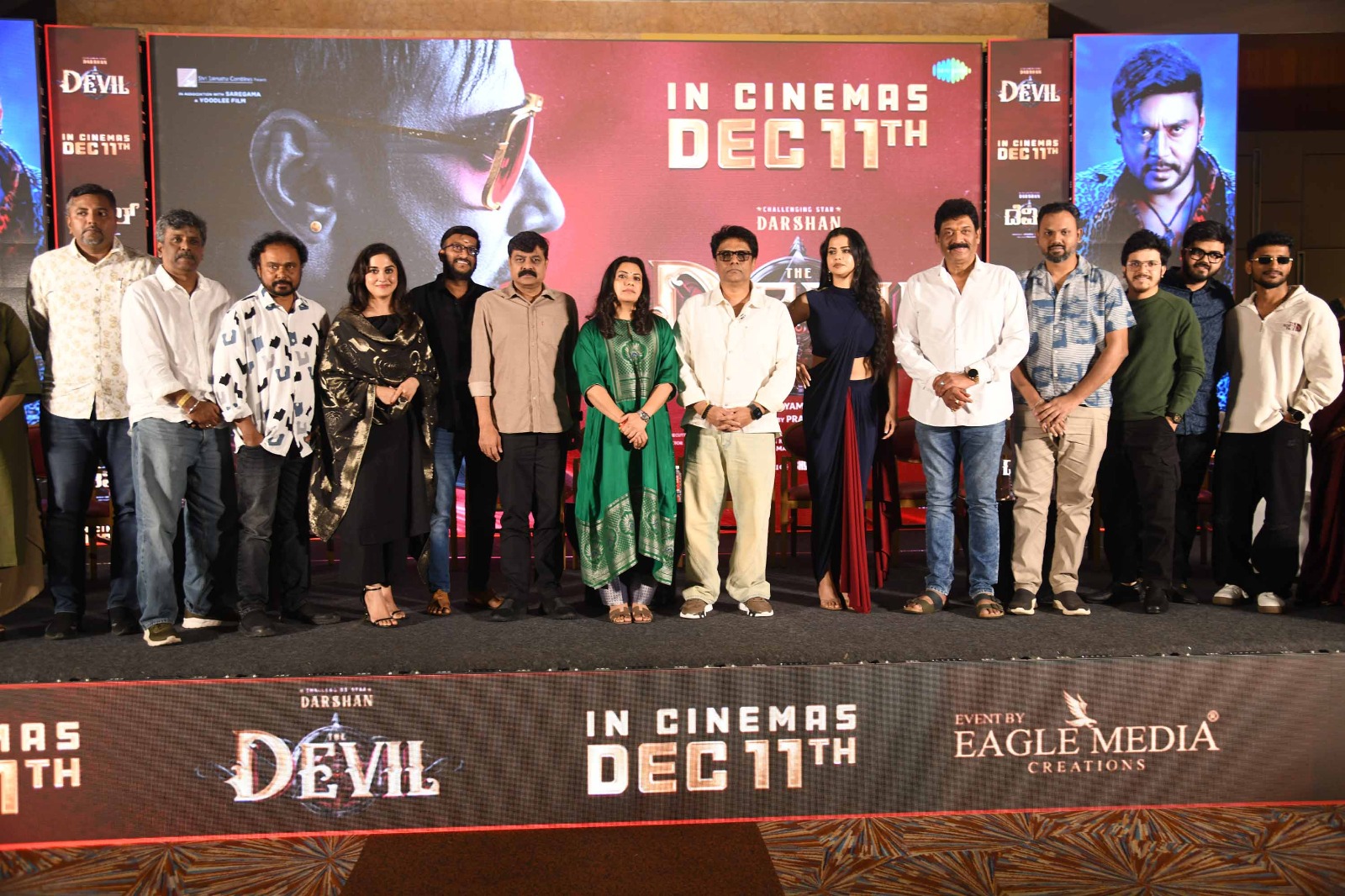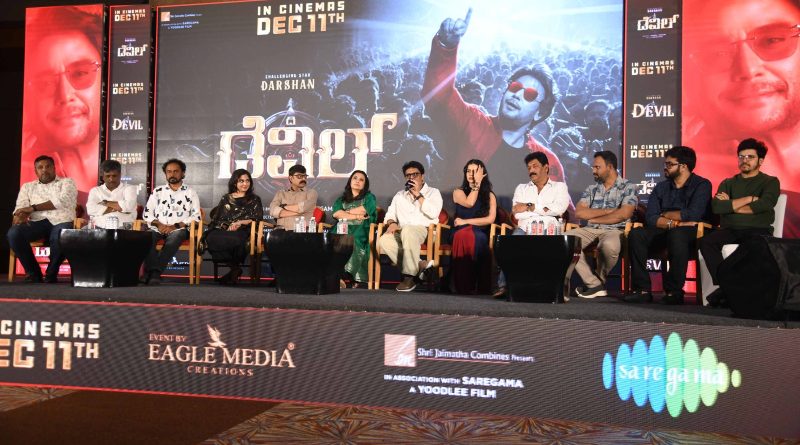 ಶ್ರೀ ಜೈ ಮಾತ ಕಂಬೈನ್ಸ್ ಲಾಂಛನದಲ್ಲಿ ಅದ್ದೂರಿಯಾಗಿ ನಿರ್ಮಾಣವಾಗಿರುವ, ಪ್ರಕಾಶ್ ವೀರ್ ಕಥೆ, ಚಿತ್ರಕಥೆ ಬರೆದು ನಿರ್ದೇಶಿಸಿರುವ ಹಾಗೂ ಚಾಲೆಂಜಿಂಗ್ ಸ್ಟಾರ್ ದರ್ಶನ್ ನಾಯಕರಾಗಿ ನಟಿಸಿರುವ ಬಹು ನಿರೀಕ್ಷಿತ “ದಿ ಡೆವಿಲ್” ಚಿತ್ರ ಇದೇ ಡಿಸೆಂಬರ್ 11 ರಂದು ರಾಜ್ಯಾದ್ಯಂತ ಅದ್ದೂರಿಯಾಗಿ ಬಿಡುಗಡೆಯಾಗುತ್ತಿದೆ. ಬಿಡುಗಡೆಗೂ ಪೂರ್ವದಲ್ಲಿ ಆಯೋಜಿಸಲಾಗಿದ್ದ ಪತ್ರಿಕಾಗೋಷ್ಠಿಯಲ್ಲಿ ಚಿತ್ರತಂಡದ ಸದಸ್ಯರು “ದಿ ಡೆವಿಲ್” ಚಿತ್ರದ ಕುರಿತು ಮಾತನಾಡಿದರು.